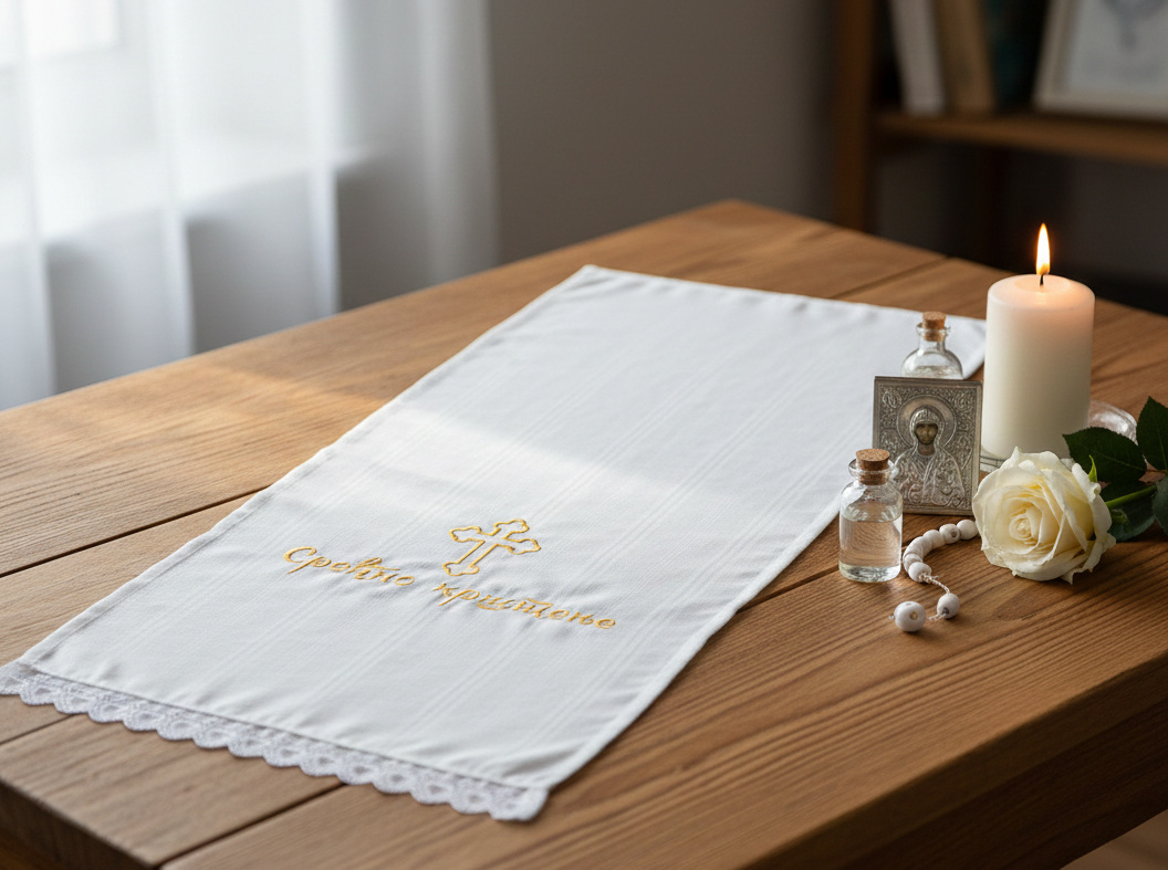 • Platno za krštenje (Krizma): Belo platno u kojem se dete umotava nakon tri uranjanja u vodu. Preporučujemo personalizovano platno na kojem je izvezeno ime i datum, jer će to biti trajna uspomena.