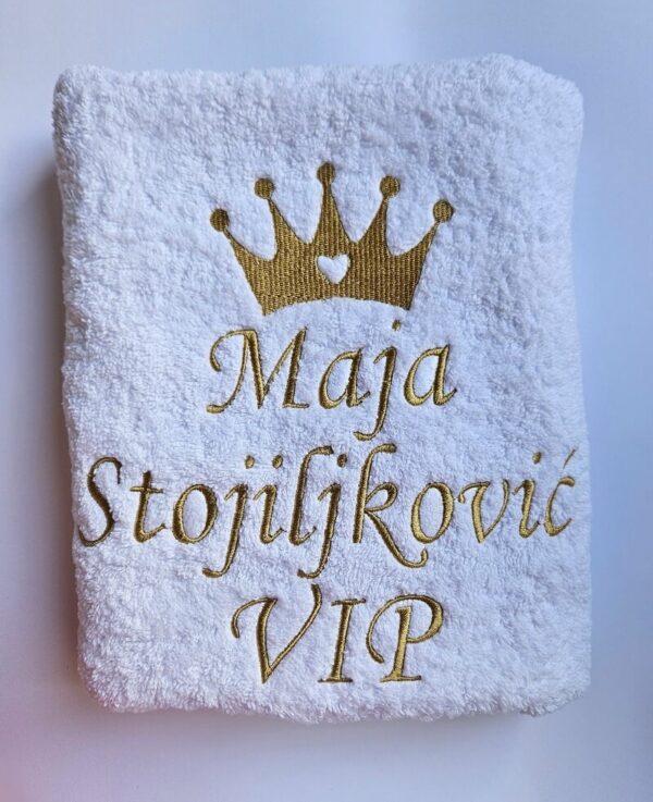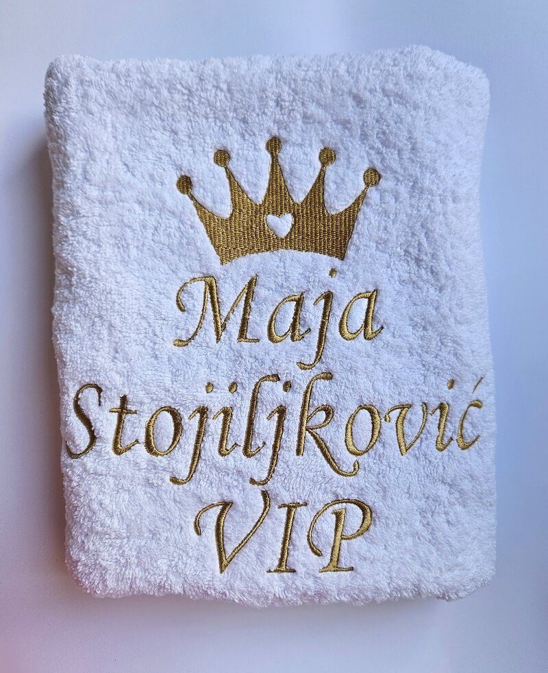 Ovaj personalizovani frotirski peškir izrađen je od 100% pamuka, sa težinom od 500 g/m², što ga čini izuzetno mekim, upijajućim i prijatnim za kožu. Frotirska tkanina je poznata po svojoj gustini i sposobnosti da brzo upija vlagu, dok personalizovani vez daje peškiru ličnu i emotivnu vrednost.