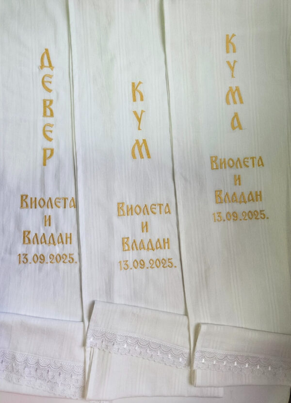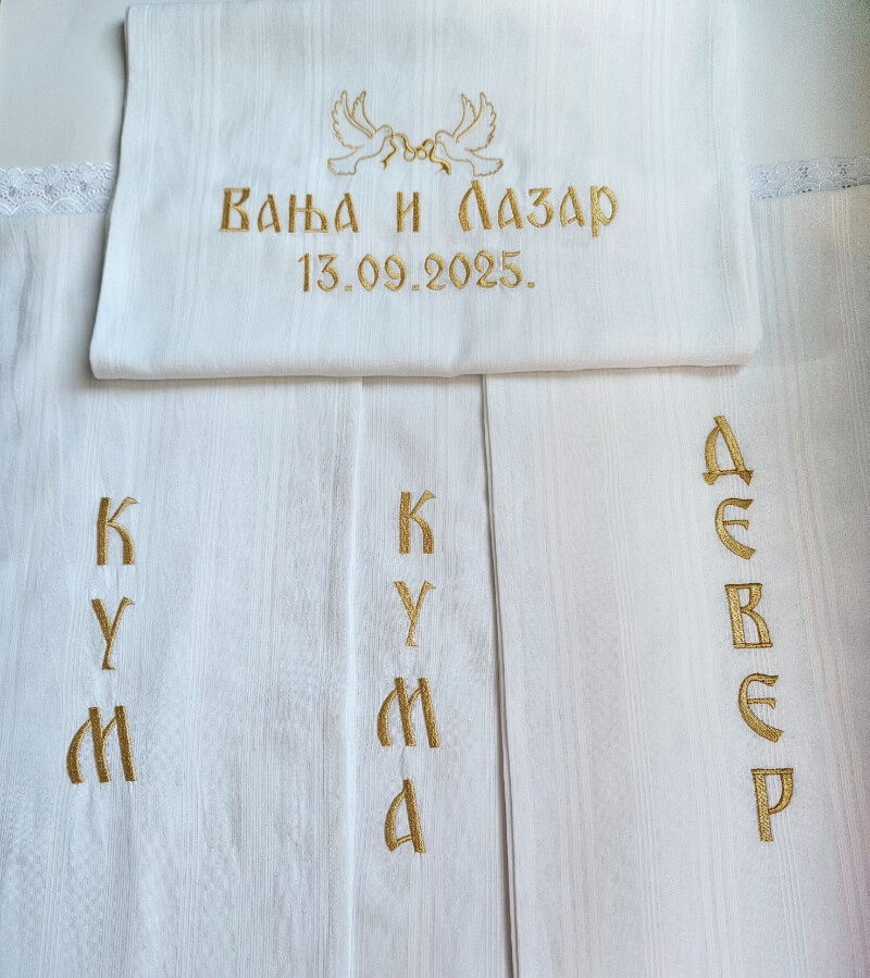 Svečani peškir od srpskog platna, dimenzija 30×240 cm, izrađen od 100% prirodnog pamuka. Namenjen je za venčanja i druge svečane prilike. Peškir je ukrašen elegantnim vezom, čime dobija poseban estetski i simbolički značaj.