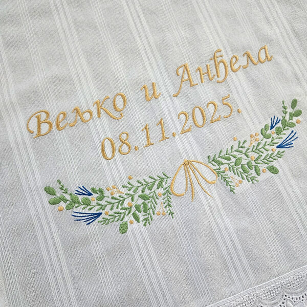 Svečani peškir od srpskog platna, dimenzija 40×160 cm, izrađen od 100% prirodnog pamuka. Namenjen je za krštenja, venčanja i druge svečane prilike. Peškir je ukrašen elegantnim vezom, čime dobija poseban estetski i simbolički značaj.